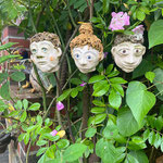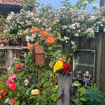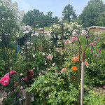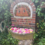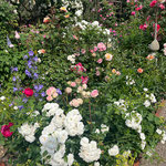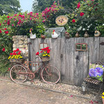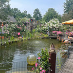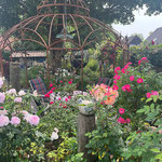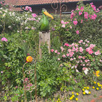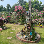 Ein weiteres Highlight sind über 380 verschiedene Rosen mit ihren Begleitstauden. Bis zu 10 m lange Rambler - und Kletterrosen an 20 Rosenbögen, Pergolen und Holzwänden lassen den Garten in die Höhe wachsen. Alte einmalblühende Strauchrosen, Nostalgie - und Edelrosen, englische Rosen sowie mehrere Rosenbäumchen verwandeln ab Juni den Garten mit überwältigen Blütenflor und betörenden Rosenduft in eine Märchenoase. Unterstützt wird dieser Zauber durch viele selbstgetöpferte farbig glasierte, märchenhafte Tiere und Figuren, die zum Teil auch käuflich zu erwerben sind.