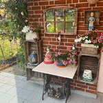 Eimern und Zinkmülltonnen, sowie Wasserspeiern lassen besonders mediterrane Kräuter gedeihen. Dazu gesellt sich der Genuss eigener Tomaten und Gurken aus dem Gewächshaus.