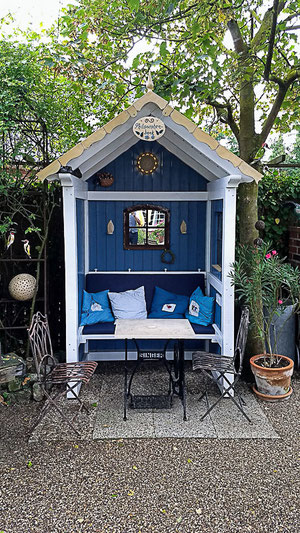 Strandkorb, viele kleine Tische aus Nähmaschinengestellen, nostalgische Holzklappstühle, Deckchairs und gelbe Sonnensegel laden zum Entspannen ein.